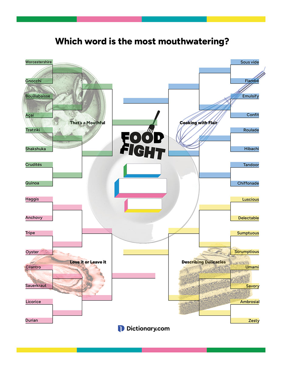 The bracket is set and it’s time for the ultimate Dictionary.com Food Fight! This bracket season, words go head-to-head in a showdown of flavor. Our four divisions include That’s a Mouthful, Cooking with Flair, Love it or Leave It, and Describing Delicacies.