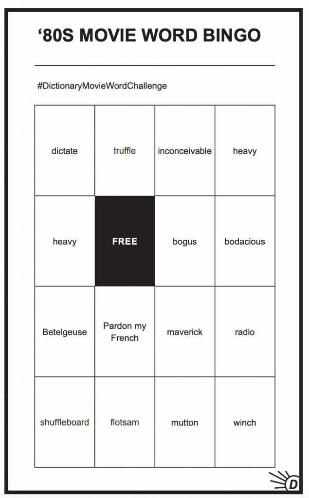 Introducing part two of the Dictionary.com Movie Word Challenge: Bingo time! We’ve put together a vocabulary guide to make all the extra screen time into learning time, and we’ve added some Bingo cards you can print out (or just pull up on your phone) to help make these new words stick!